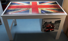 • Bureau en bois datant de 1986. Repeint en blanc et relooké sur le thème de Londres avec 2 adhésifs : un pour le plateau et un pour les tiroirs. Super content et très beau rendu.
